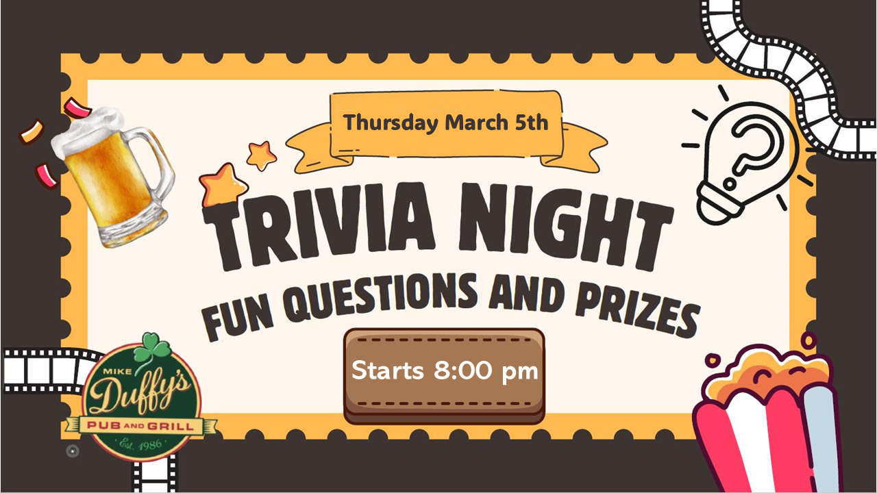 Join us this week (3/5) for Trivia Thursday!! Fun questions and drink specials!! Sign up at least one day before event (in restaurant) and get a free appetizer night of event. NOTE: Starts at 8:00 pm this week only.