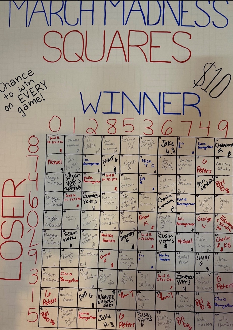 For EVERY GAME in the 2026 NCAA tournament (not counting "first round" play-in games), the person who owns the box that corresponds to the last digit of the score for both the winning and losing team wins the amount assigned for that round. For instance, if the final score is 82-78, the person who owns the square with WINNER 2 and LOSER 8 wins.